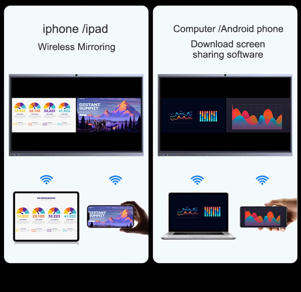 케이블이 없는 이 솔루션은 광범위한 장치 호환성과 선명하고 동기화된 프로젝션을 제공합니다. 비디오, 음악 및 문서를 원활하게 공유할 수 있도록 대화형 역방향 제어를 통해 다중 사용자 화면 공유가 가능합니다.
